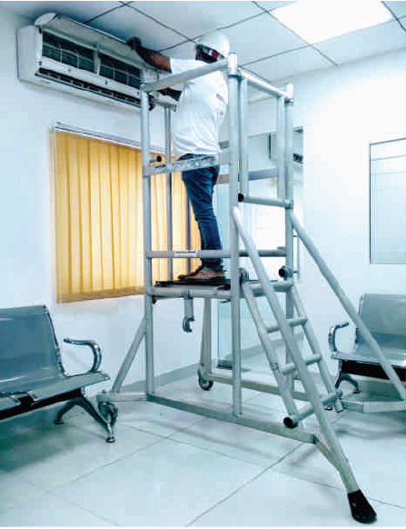 It is folding (collapsible) mobile access platform. It is a solid, stable and secure work platform, designed to withstand all types of site conditions. It is easy to assemble and can pass through narrow door ways. It’s a great work station for applications like working on a machine for long duration or in a warehouse or for any industrial application of repairs and maintenance at a platform height of 3 to 4.5ft.
